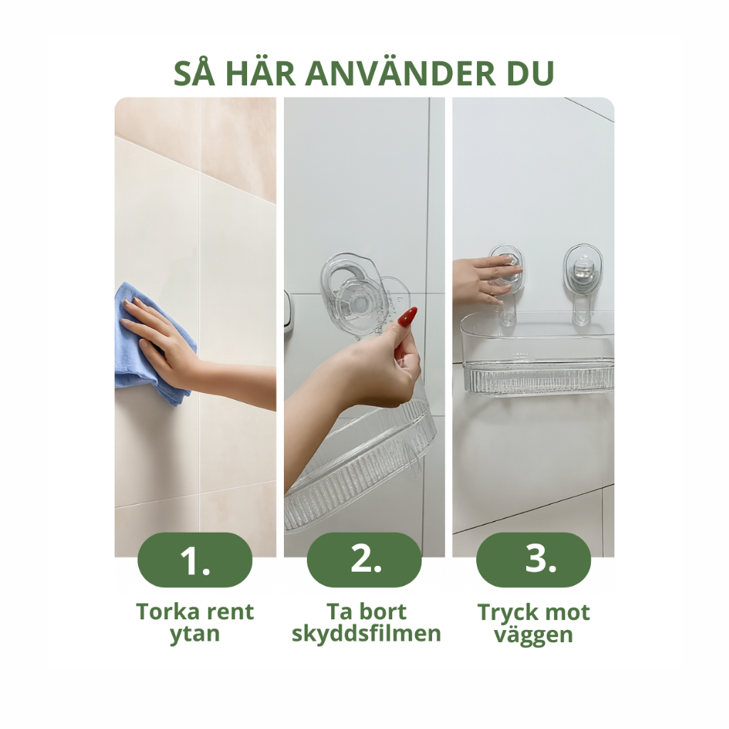 Trött på att flaskor och prylar trängs överallt – utan någon plats att ställa dem? I badrummet, köket eller duschen samlas saker snabbt, men lösningarna är ofta dåliga: rangliga hyllor, fula hål i väggen eller klister som släpper efter en vecka.