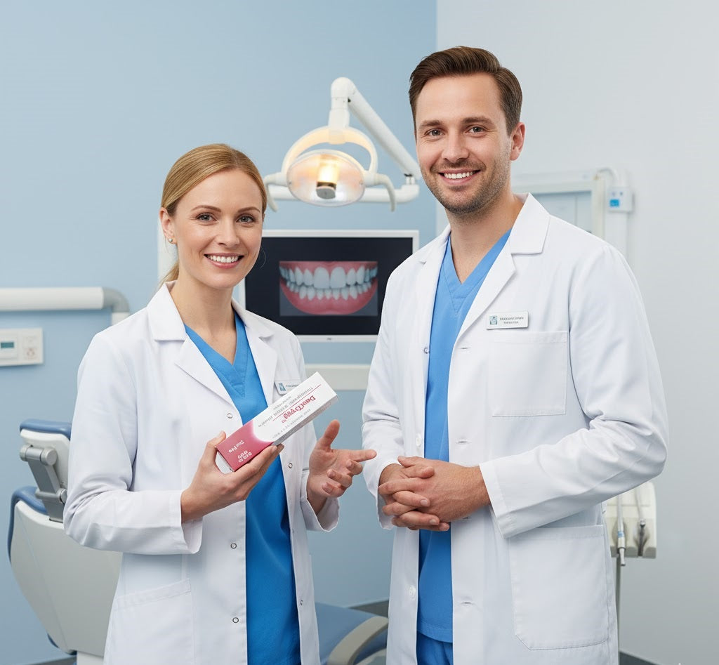 “Som tandläkare rekommenderar jag DentTrygg™ till patienter som behöver pålitlig stabilitet för sina proteser. Den zinkfria och tandköttsvänliga formulan ger ett säkert grepp hela dagen och ökad komfort. Ett enkelt och effektivt val för både hel- och delproteser.”