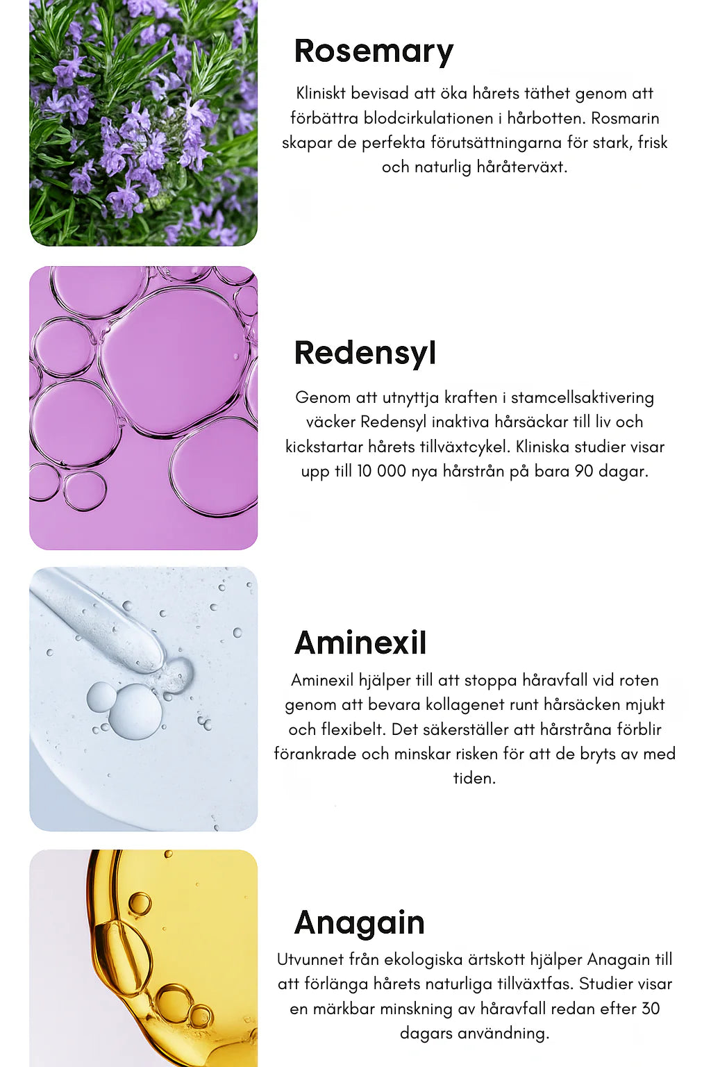 • Redensyl® – stimulerar hårsäckar i vilofas.