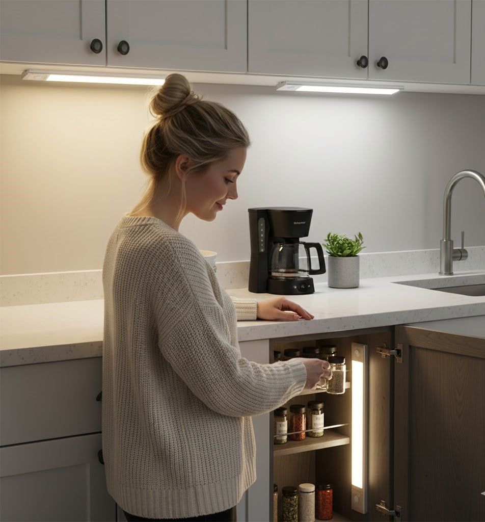 Upplev hur KlokLjus™ automatiskt tänder ljuset när du närmar dig rummet, hallen eller garderoben. Den intelligenta induktionstekniken känner av rörelse och ger direkt belysning – perfekt för sena kvällar eller mörka områden där du behöver trygghet och komfort.