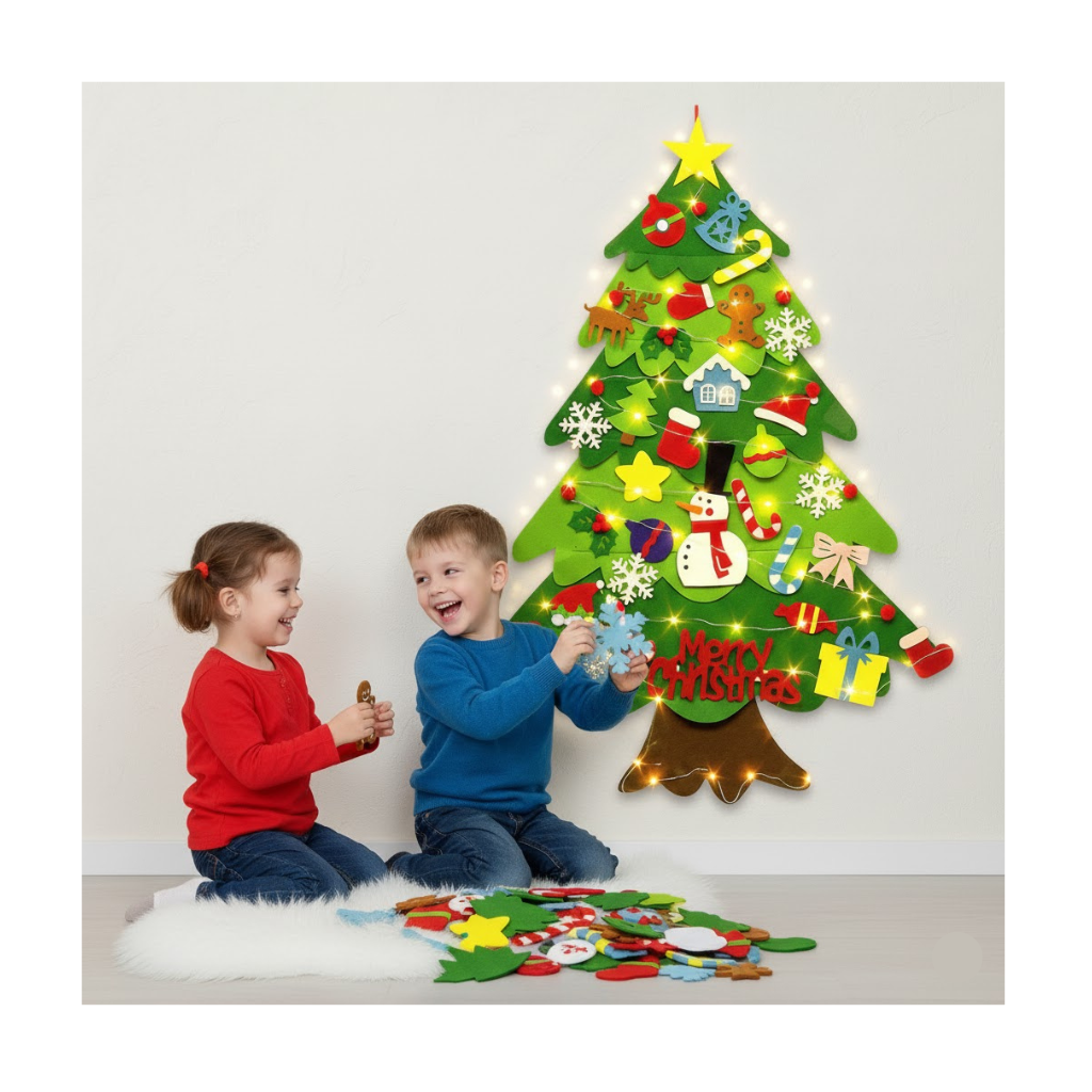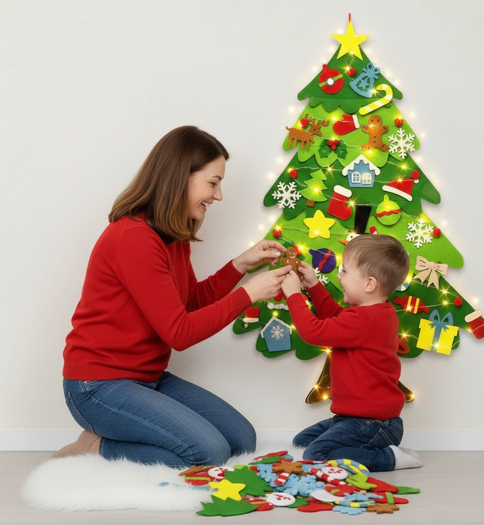 Denna väggmonterade julgran i filt är det säkra, lekfulla och platsbesparande alternativet – speciellt utformad för nyfikna små barn!