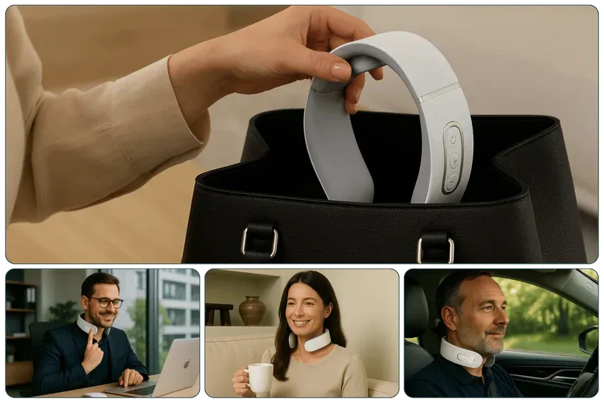 Oavsett om du sitter i soffan, är på kontoret eller är på språng kan du använda NackLindra™ när som helst och var som helst tack vare det kraftfulla batteriet.