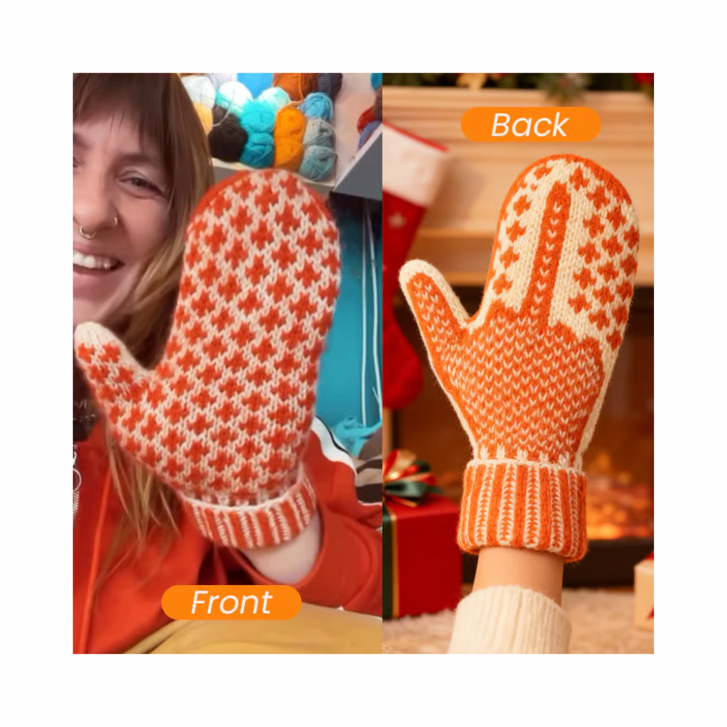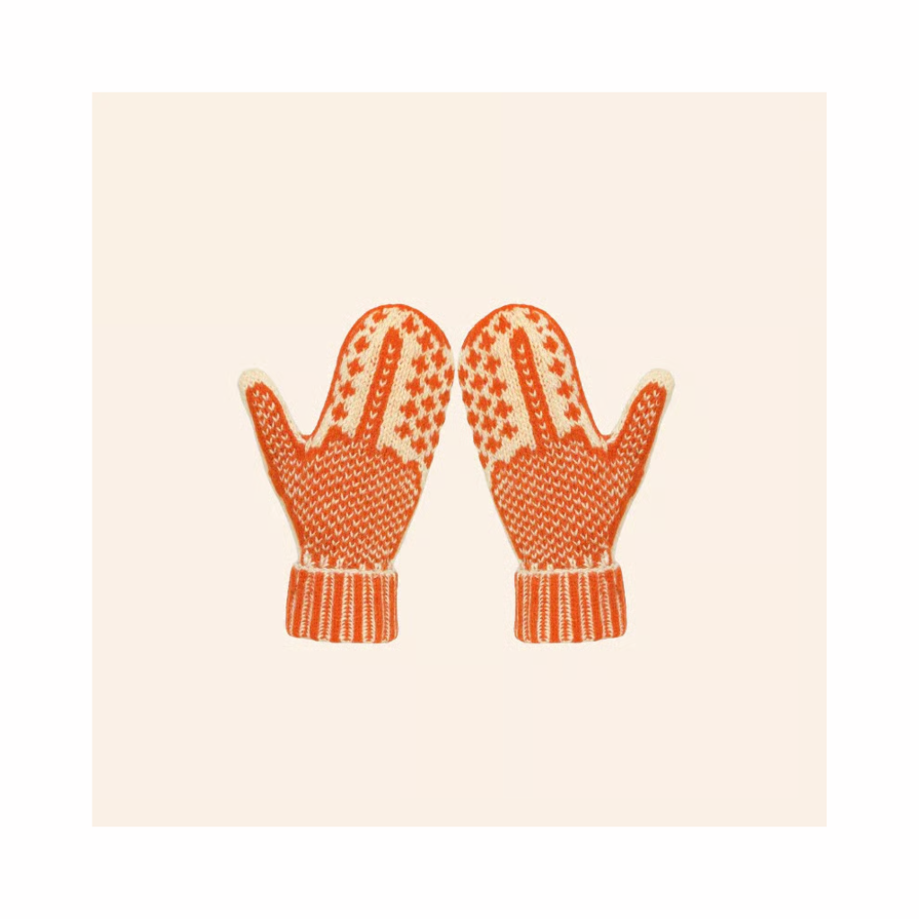 Dessa lysande orange-krämfärgade handskar har ett klassiskt nordiskt mönster med enrolig hemlighet. När du lyfter handen avslöjar mönstret en stor, pixlig långfinger. Det perfekta sättet att säga "hej" till iskalla temperaturer – eller till din bästa vän!