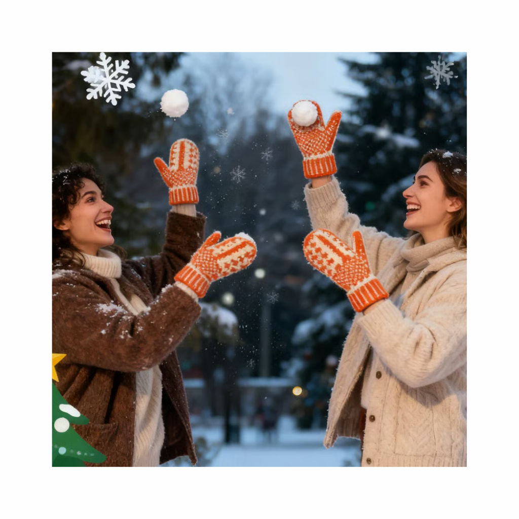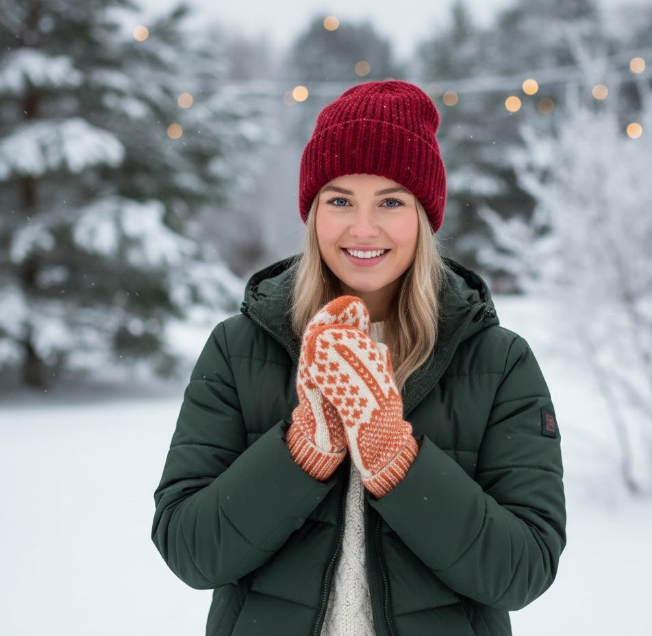 Den lysande orange färgen sticker ut tydligt mot den vita snön. Perfekt för vinter-selfies, julfester eller bara för att ge din dagliga väg till jobbet lite extra "piff".