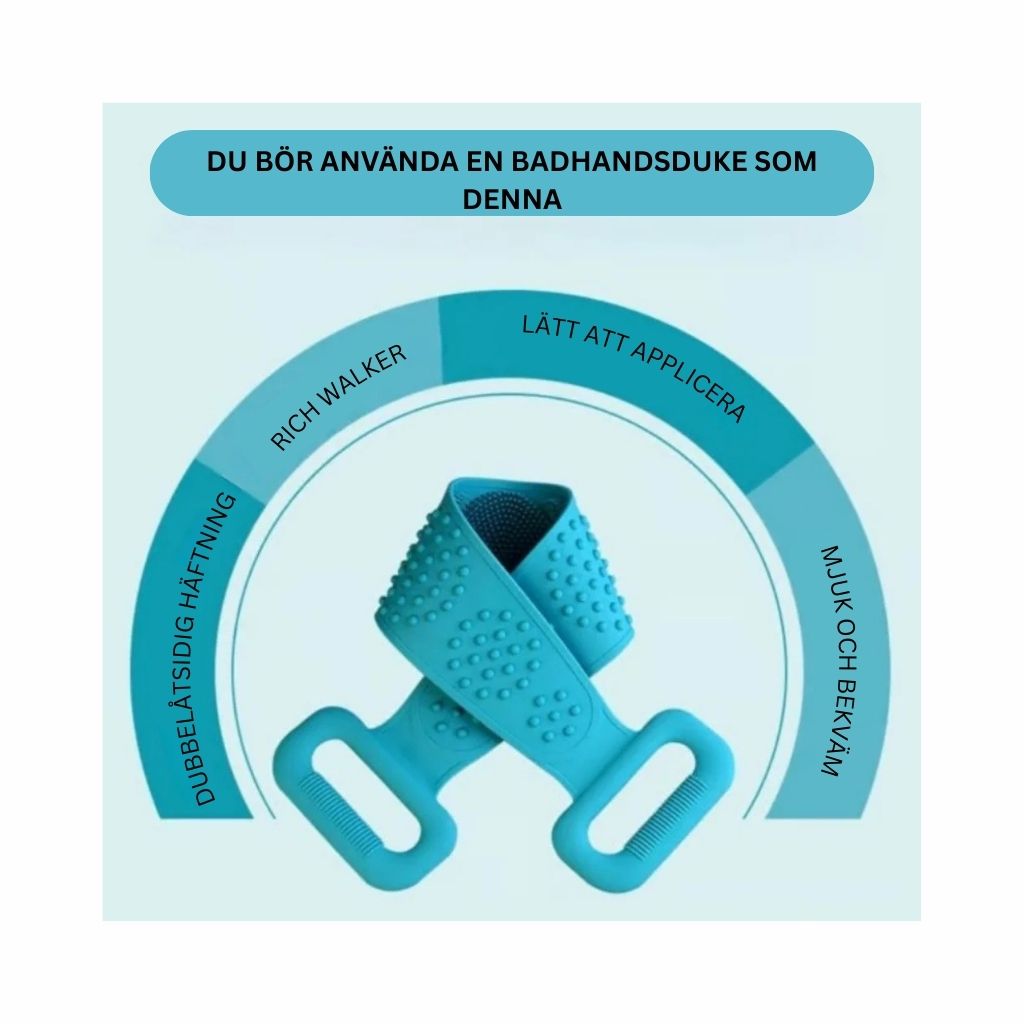 "Slitit med att inte nå ryggen ordentligt i duschen. RyggBorste Flex™ gör det otroligt enkelt – når överallt tack vare de långa handtagen och det flexibla bandet. Silikonen är mjuk men rengör perfekt. Huden känns renare, slätare och friskare. Slut på att be om hjälp! Rekommenderas varmt."