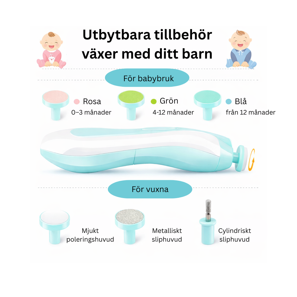 Att klippa bebisnaglar kan kännas nervöst. Naglarna är små och mjuka, och ett litet misstag kan orsaka ett sår. Med TryggFil™ filas naglarna försiktigt istället för att klippas, vilket gör att du kan vårda dem säkert och noggrant.